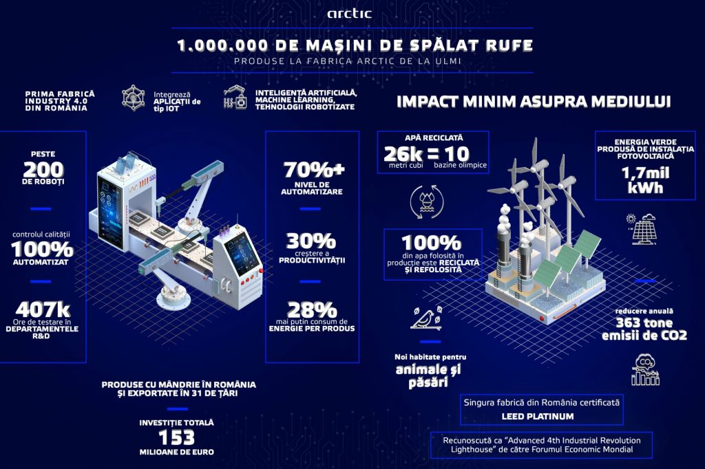 Compania Arctic, liderul pieței de electrocasnice din România și unul dintre principalii contribuabili la economia locală, marchează producția a 1.000.000 de mașini de spălat rufe la fabrica de la Ulmi, județul Dâmbovița, prima fabrică din România care funcționează după principiile Industry 4.0 și una dintre cele mai moderne facilități de producție din Europa.