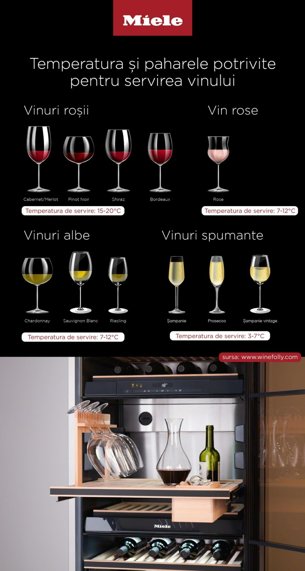 Gustul vinului este influențat atât de temperatura și modul de depozitare, cât și de tipul paharului din care este servit. Potrivit www.winefolly.com, temperatura ideală de servire variază în funcție de culoarea vinului, între 15–20°C pentru vinurile roșii și între 7–12°C  pentru vinurile albe. Este recomandat ca paharele de vin să fie transparente și să nu aibă integrat niciun model.