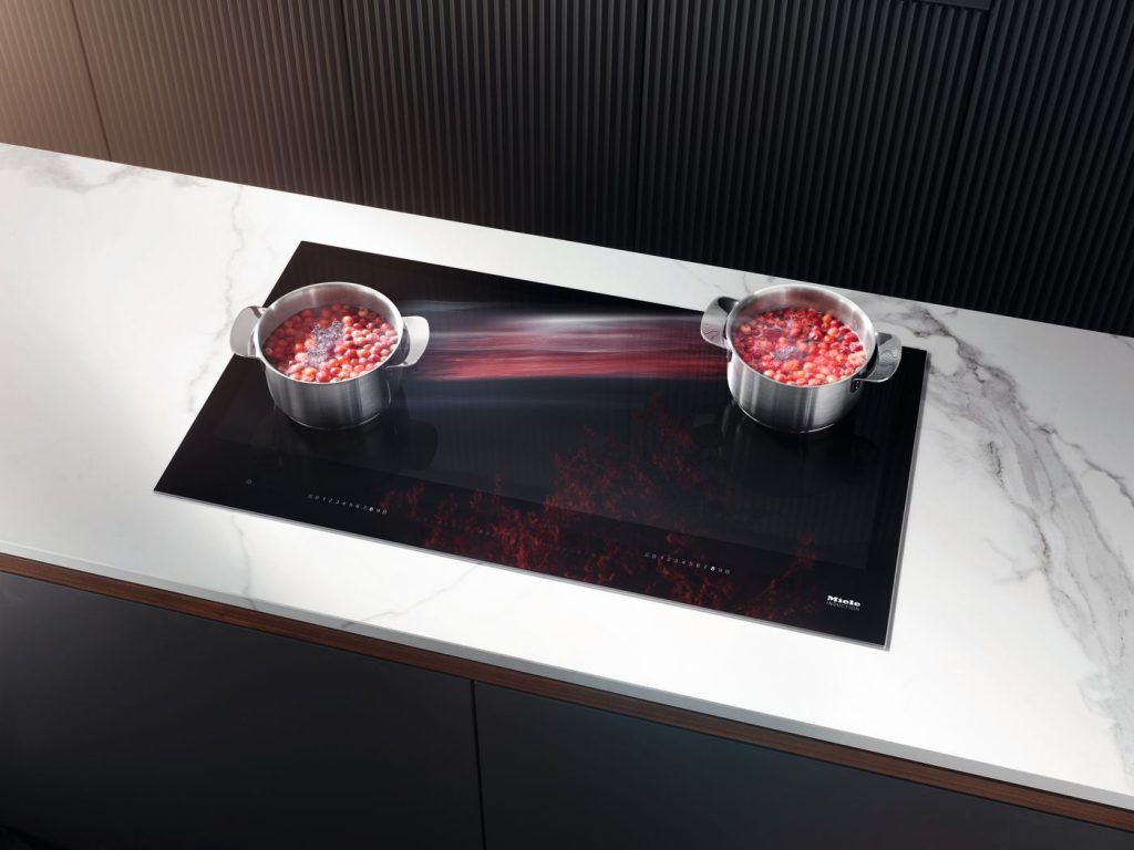 Pentru pasionații de gastronomie, plita cu inducție KM 7897 FL oferă o flexibilitate fără precedent, grație unei alte inovații tehnologice Miele. Astfel, pe suprafața ceramică de 90 de centimetri pot fi poziționate oriunde până la 6 tigăi și oale, pentru că plita va recunoaște automat poziția lor și va activa procesul de încălzire.
