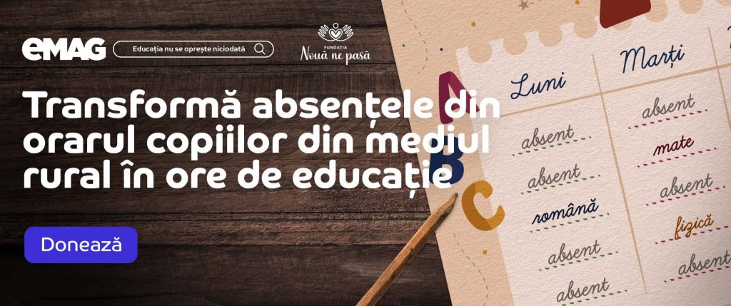 Anul școlar 2022-2023 a debutat cu aceeași problemă acută a abandonului școlar, fenomen care afectează din ce în ce mai multe forme de învățământ și poziționează România pe primul loc în clasamentul Uniunii Europene la acest capitol. În acest context și încurajați fiind de rezultatele obținute până acum în ceea ce privește educația remedială în ciclul primar, eMAG și Fundația Nouă ne pasă lansează o nouă campanie de conștientizare a abandonului școlar, prin care își propun să strângă donații care să transforme absențele din orarul copiilor din mediul rural în ore de educație: „Orarul Clasei care nu se lasă”.