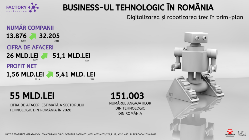 Și România face pași înainte, dovadă evoluția semnificativă a business-ului din sectorul tehnologic (coduri CAEN 6201,6202,6203,6209,721,7112, 4652, 4651). Numărul companiilor care activează în aceste domenii, de la fabricarea echipamentelor industriale și cercetare/dezvoltare în inginerie, la realizarea software-ului, consultanță, managementul mijloacelor de calcul, comerțul cu ridicata al componentelor și echipamentelor de calcul, a crescut semnificativ în ultimii 10 ani, de la 13.876 în 2010 la 32.205 firme în 2018.