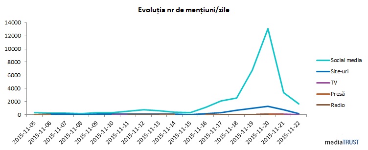 După cum era de așteptat, vineri, 20 noiembrie, este ziua cu cele mai multe menționări pe site-urile de știri, 1.013, pe Facebook – 13.122, TV – 63, radio – 29, iar în presa scrisă – 30 de mențiuni.