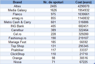 Monitorizare publicitate 1 – 22 noiembrie 2015, surse admonit: 21 posturi de televiziune, 11 posturi de radio şi 200 de publicaţii centrale. Costul estimat in euro a fost calculat pe baza valorii de Rate Card.