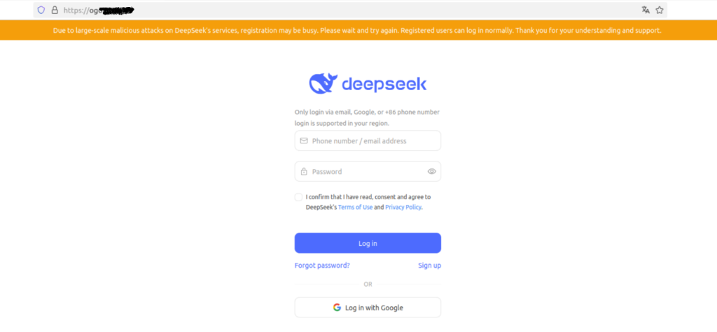 Din cauza numărului mare de utilizatori noi și a unui presupus atac cibernetic asupra DeepSeek, există erori în procesul de înregistrare pe aplicația și site-ul web DeepSeek – multe înregistrări nu pot fi finalizate. Această situație poate fi exploatată de infractorii cibernetici pentru a fura acreditările utilizatorilor prin pagini web false care imită DeepSeek.