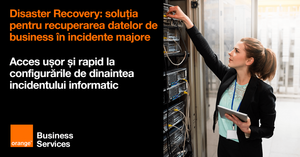 Orange Business Services (OBS) lansează soluția Disaster Recovery ce oferă companiilor acces la o replică funcțională și actualizată a infrastructurii și aplicațiilor de business, în orice circumstanțe, chiar și în cazul unor incidente majore care implică pierderea datelor (probleme tehnice, dezastre naturale, atacuri cibernetice etc.).