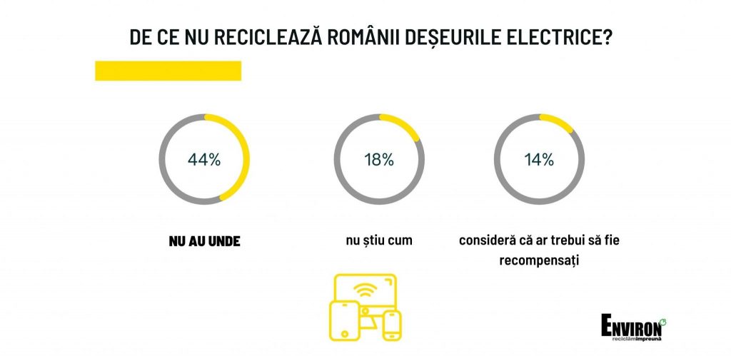Chestionați cu privire la motivele pentru care nu reciclează mai des, românii au declarat că nu au puncte de reciclare în apropiere (44%), nu au informații despre cum pot să recicleze aparatura veche (18%) sau consideră că ar trebui să fie recompensați (14%).