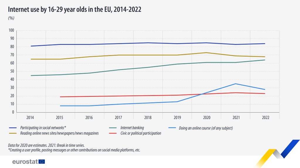 În 2022, doar 23% dintre tineri au folosit internetul în scopuri civice sau politice, aceasta fiind o activitate care a înregistrat creșteri ușoare din 2015.